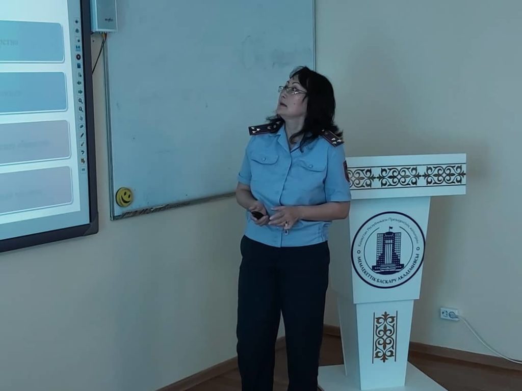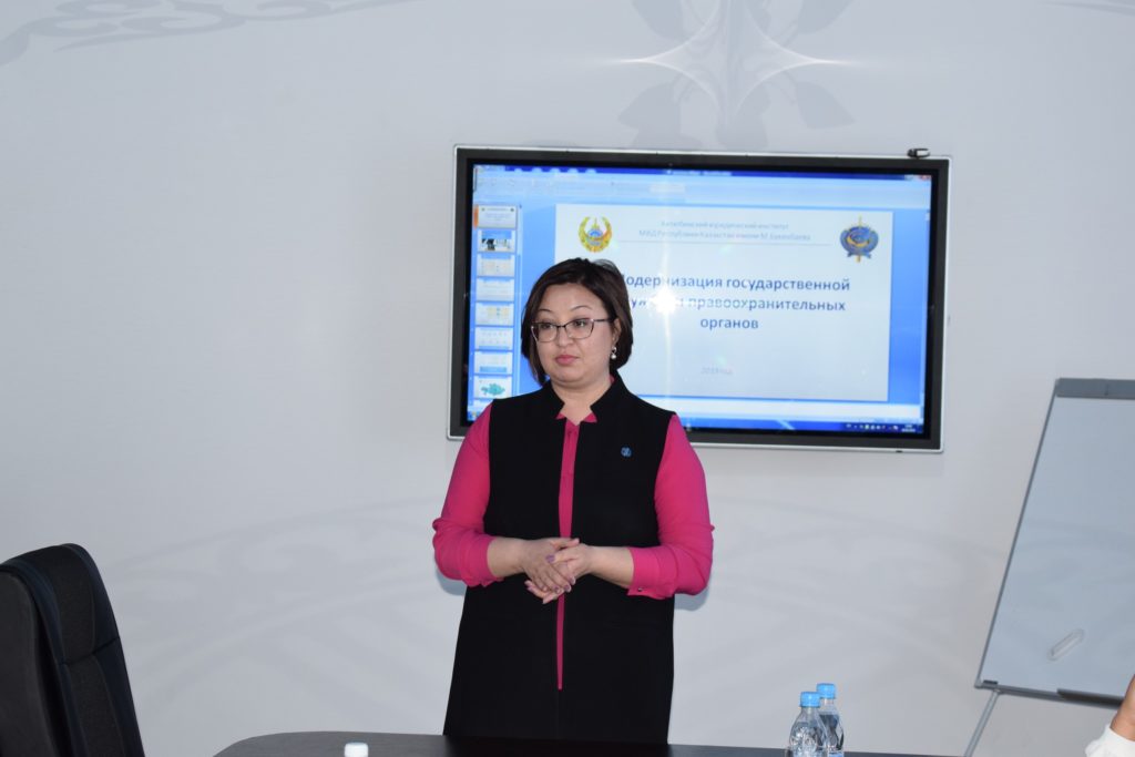 Е. К. Балымов – Қазақстан Республикасы ІІМ М. Бөкенбаев атындағы Ақтөбе заң институтының ӘҚ ж ІІО ӘҚ кафедрасының бастығы, полиция майоры «Құқық қорғау органдарының мемлекеттік қызметінде клиенттік бағдарлаудың нәтижесі мен принциптері» тақырыбында.