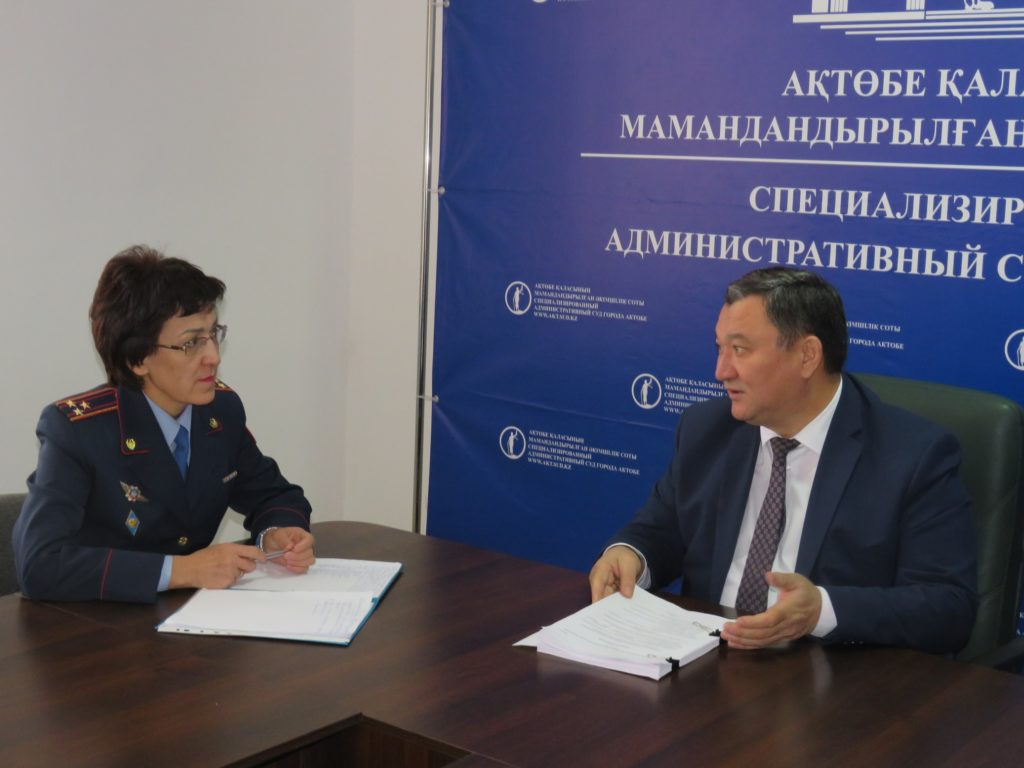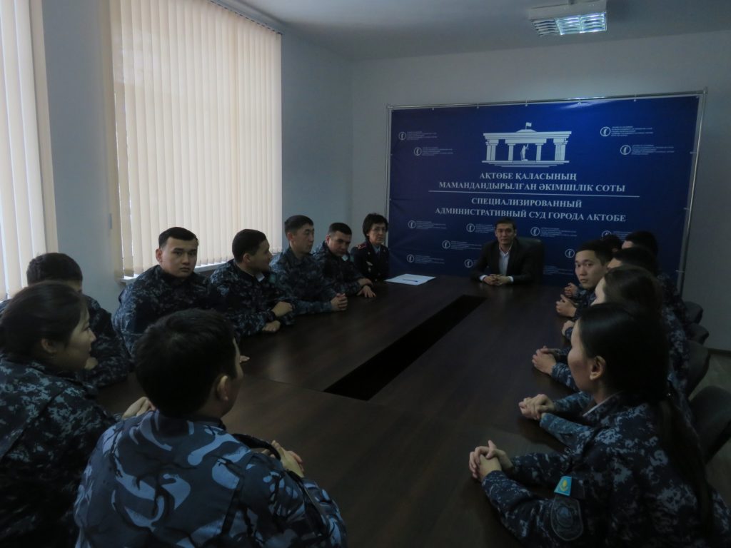 Ақтөбе қаласының мамандандырылған әкімшілік сотының практикалық қызметімен тікелей танысу, практикалық-бағдарлы оқыту деңгейін арттыру және кәсіби құзыреттілігін қалыптастыру мақсатында 2019 жылғы 26 қарашадағы Қазақстан Республикасы ІІМ М. Бөкенбаев атындағы Ақтөбе заң институтының ӘҚжІІОӘҚ кафедрасының оқытушысы полиция майоры В.В.Хасанова “Кәсіби дайындық” пәні бойынша арнайы бастапқы оқыту курсының 5-взвод тыңдаушылары үшін тәжірибелік шығу сабағын өткізді.