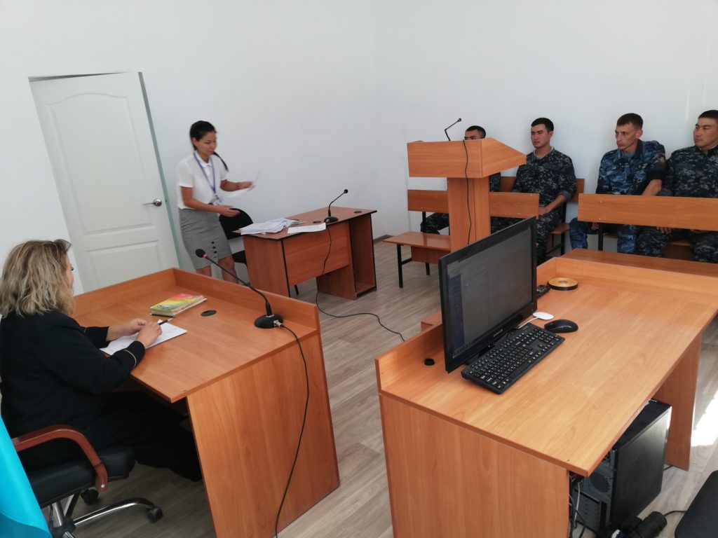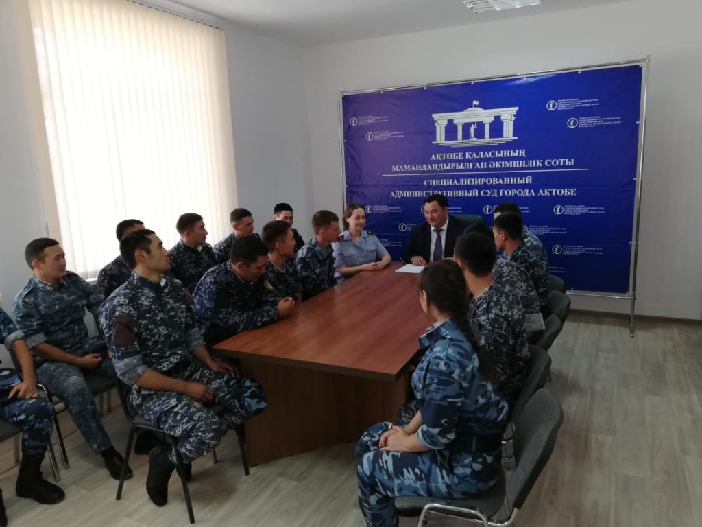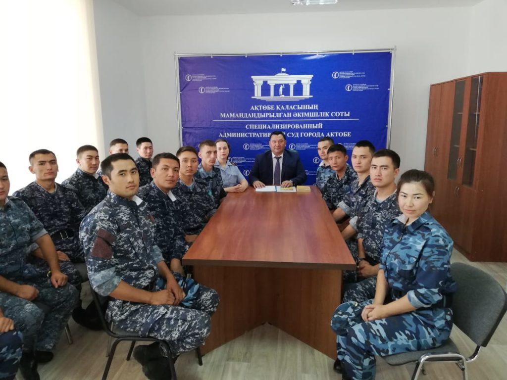 Ақтөбе қаласының мамандандырылған әкімшілік сотының практикалық қызметімен тікелей танысу, практикалық-бағдарлы оқыту деңгейін арттыру және кәсіби құзыреттілігін қалыптастыру мақсатында 2019 жылғы 17 шілдеде Қазақстан Республикасы ІІМ М. Бөкенбаев атындағы Ақтөбе заң институтының ӘҚжІІОӘҚ кафедрасының оқытушысы полиция майоры В. В. Хасанова “Кәсіби дайындық” пәні бойынша арнайы бастапқы оқыту курсының 5 және 7- взвод тыңдаушылары үшін тәжірибелік шығу сабағын өткізді.
