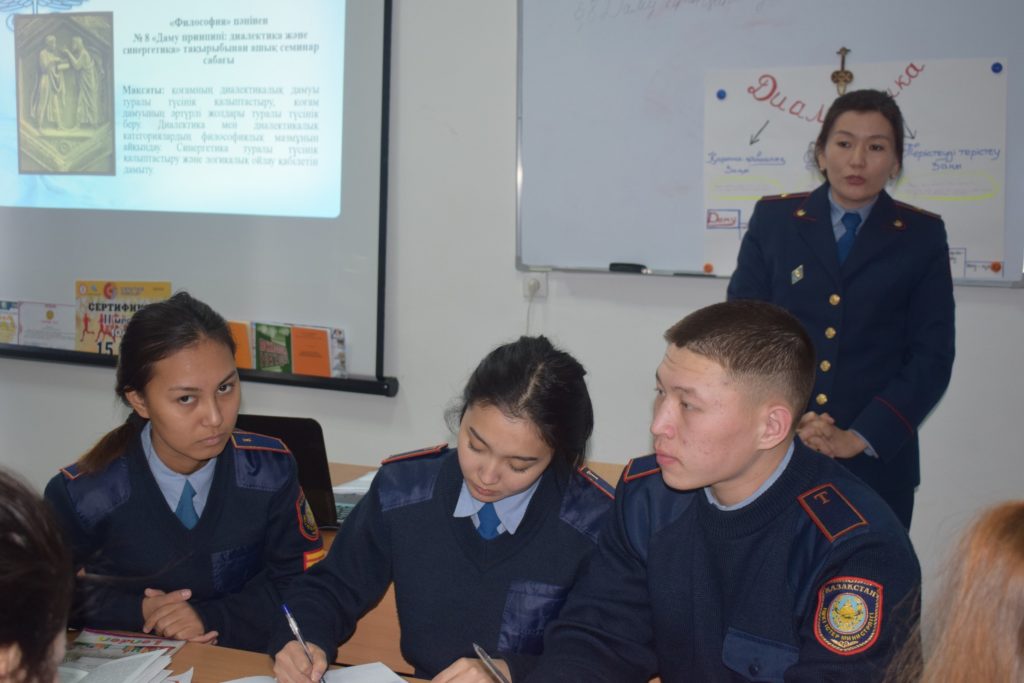 2019 жылдың 6 қарашасындажалпы білім беру пәндері кафедрасының аға оқытушысы, полиция майоры А. Ж. Жарасхан 2А курсы 203-оқу тобының курсанттарына «Философия» пәні бойынша «Даму принципі: диалектика және синергетика» тақырыбында ашық семинар сабағын өткізді. Оқу-әдістемелік орталығының әдіскерлері мен институттың профессорлық-оқытушылық құрамы ашық семинарлық сабаққа қатысып, семинардың өткізілу барысын және тақырыптың мазмұндалуын қадағалады.