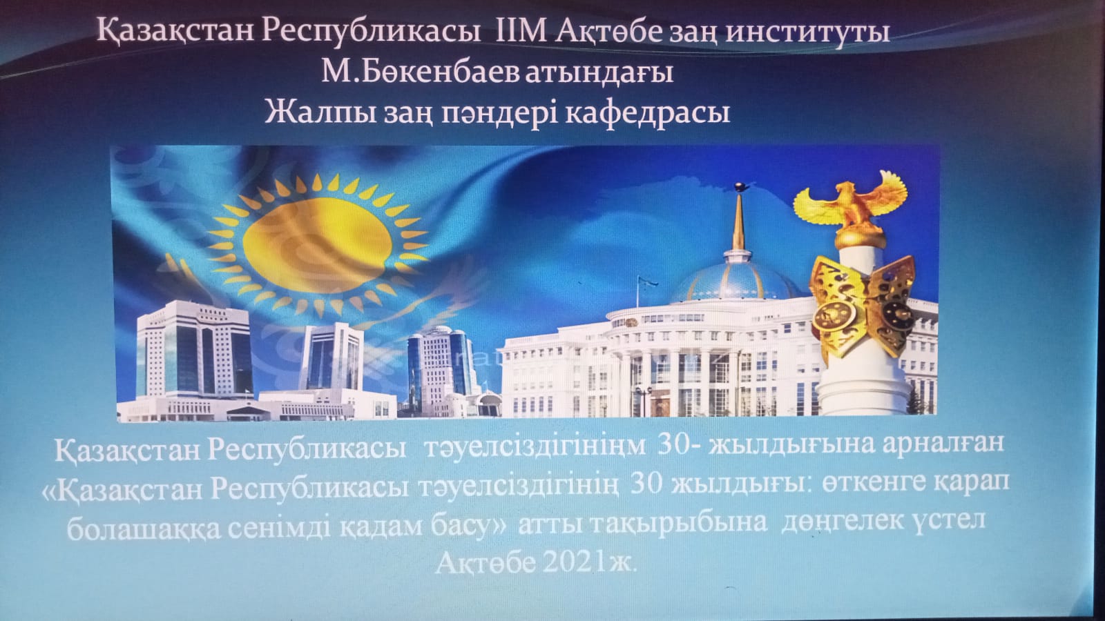 2021 жылдың 25 қарашасында Институт қабырғасында жалпы заң пәндері кафедрасының оқытушыларының ұйымдастыруымен «Заңгер» үйірмесінің шеңберінде 4 курс курсантарының қатысуымен Қазақстан Республикасы тәуелсіздігінің 30-жылдығына арналған «Қазақстан Республикасы тәуелсіздігінің 30 жылдығы: өткенге қарап болашаққа сенімді қадам басу» атты тақырыбына дөңгелек үстел өткізілді. Дөңгелек үстелдің өткізілу мақсаты: Еліміздің тәуелсіздік алу жолындағы ата — бабаларымыздың ерлігін паш ету, курсанттарға желтоқсан құрбандарымен, желтоқсан оқиғасына қатысқан аға — апалардың ерлігін үлгі етіп көрсету курсантардың туған өлкемізге деген сүйіспеншілігін, сезімдерін ояту.Елін, жерін сүюге, Отанын қастерлеуге, шыншылдыққа тәрбиелеу. Тақырыпты талқылауға кафедраның профессорлық- оқытушылық құрамымен және үйірме мүшелері Ахмет Н., Дайрабай Е.,Маметай Б. белсенді қатысты. Осылайша, іс – шара шеңберінде Қазақстанның мемлекеттілігі тарихының, тәуелсіздік жағдайындағы елдің даму стратегиясының, жаһандану және өңірлік интеграция проблемаларының өзекті мәселелері, сондай-ақ Қазақстан Республикасының Президенті Қасым-Жомарт Тоқаевтың егемен мемлекетті қалыптастырудағы шешуші рөлі туралы пікірлер қызу талқыланды.