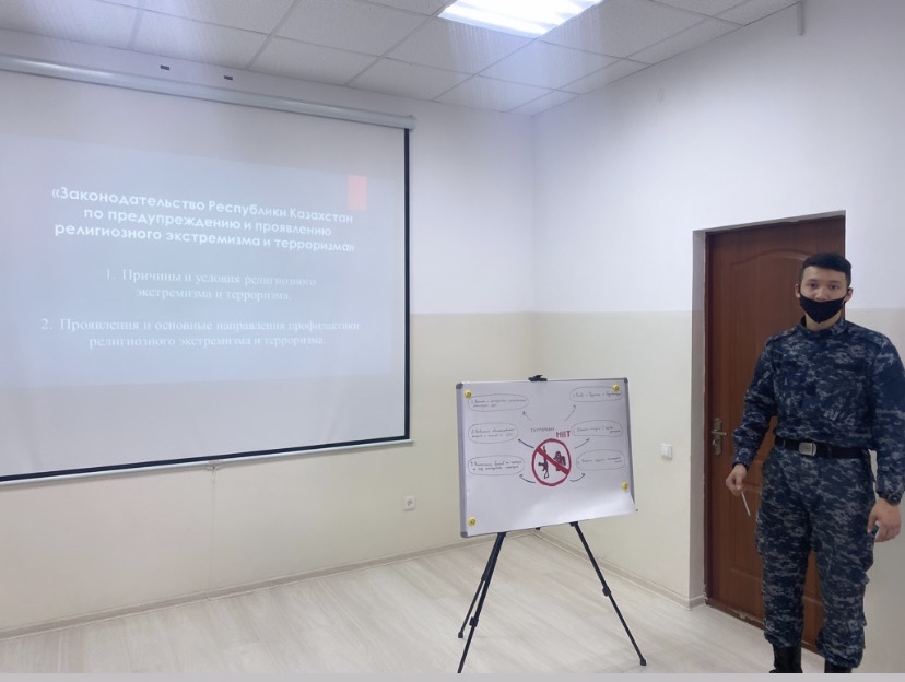 Сабақ аясында терроризм мен діни экстремизм көріністерінің түсінігі мен түрлері, қауіп кезінде және террористік актілерді жасау кезінде қоғамдық орындардағы мінез-құлық жүйесі қарастырылды. Сабақ шеңберінде нормативтік дереккөздерді пайдалана отырып, топтарда жұмыс жүргізілді, кроссвордтар шешілді, слайдтар, бейнероликтер көрсетілді, сондай-ақ статистикалық деректер талданды, бұл сабаққа қызығушылықпен қатысқан және қаралып отырған тақырып шеңберінде жалпы дүниетаныммен байланысты материалды таныстыруға ілеспе сұрақтарға жауап берген тыңдаушылардың нәтижелі жұмысына ықпал етті.