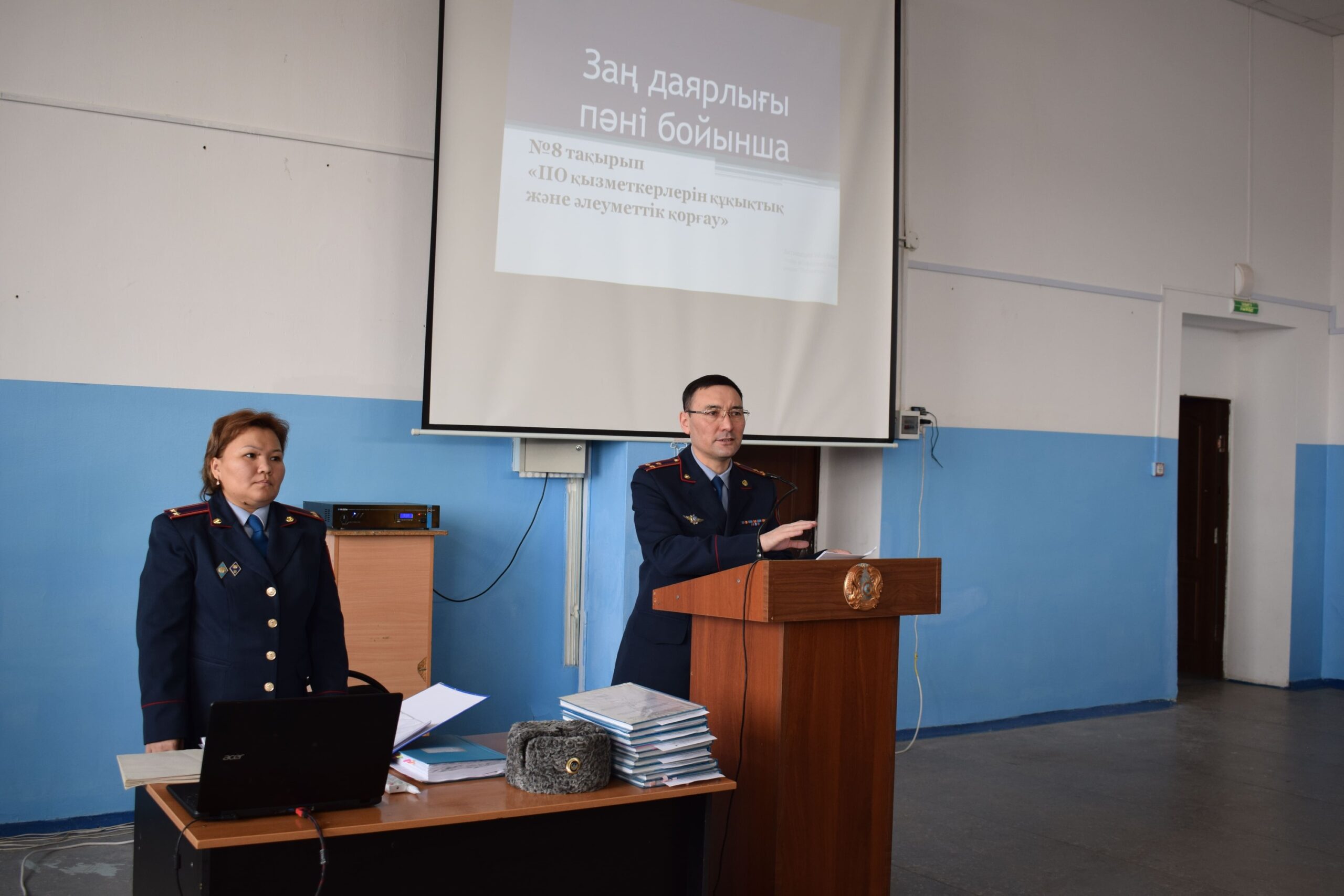 Кадр саясаты басқармасының бастығы ІІО қызметкерлерінің және олардың отбасы мүшелерінің құқықтық жағдайы, туындаған өзекті мәселелер туралы жете түсіндіріп, ерекше мазмұнда дәріс оқыды. Дәріс соңында тыңдаушылар тақырып бойынша көкейтесті сұрақтарын қойып, Қазақстан Республикасы ІІМ жүйесінде жүргізіліп жатқан жаңғырту аясында пікірлермен алмасты.