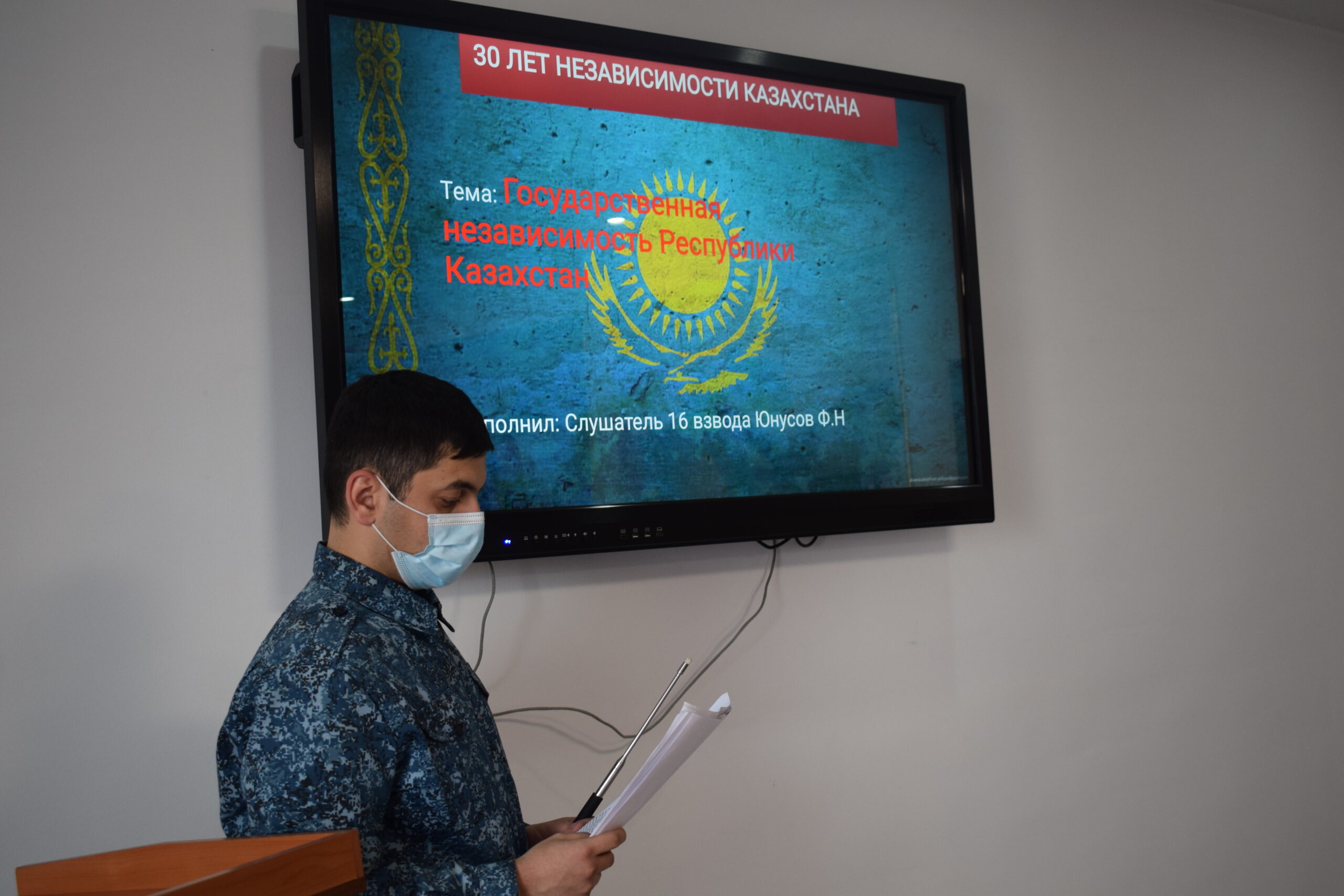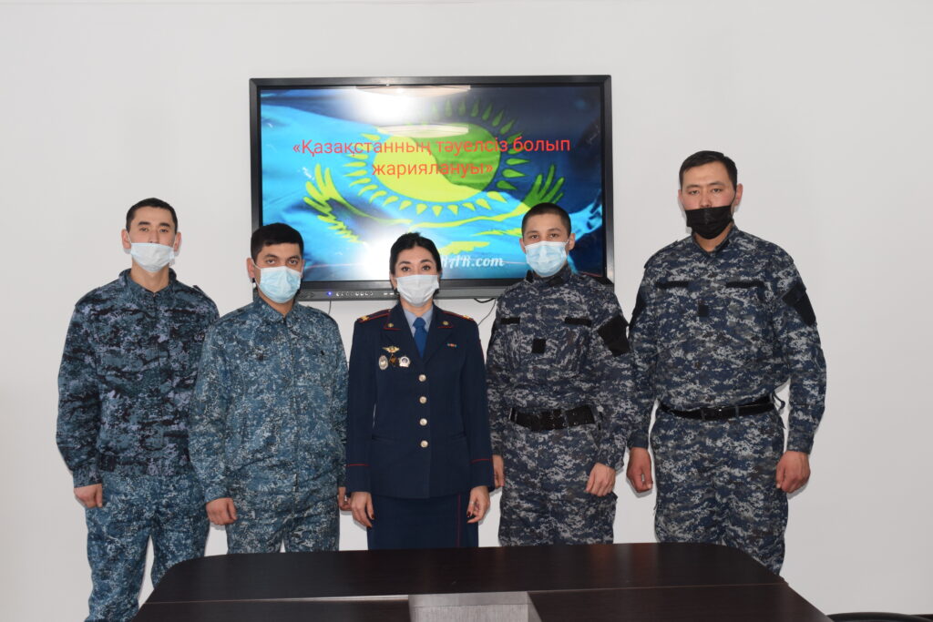 Патриоттық сезімге, Отанға деген сүйіспеншілікке, Қазақстан халқының тарихи өткені, бүгіні және жарқын болашағы үшін мақтанышқа тәрбиелеу мақсатында «Қазақстан Республикасының мемлекеттік тәуелсіздігі», «Қазақстанның тәуелсіздік жылдарындағы жетістіктері» бейнероликтері көрсетілді. Отырыс 16-взвод тыңдаушысының ғылыми үйірме қатысушысы Ф.Юнусовтің слайд-презентациясымен сүйемелденді.