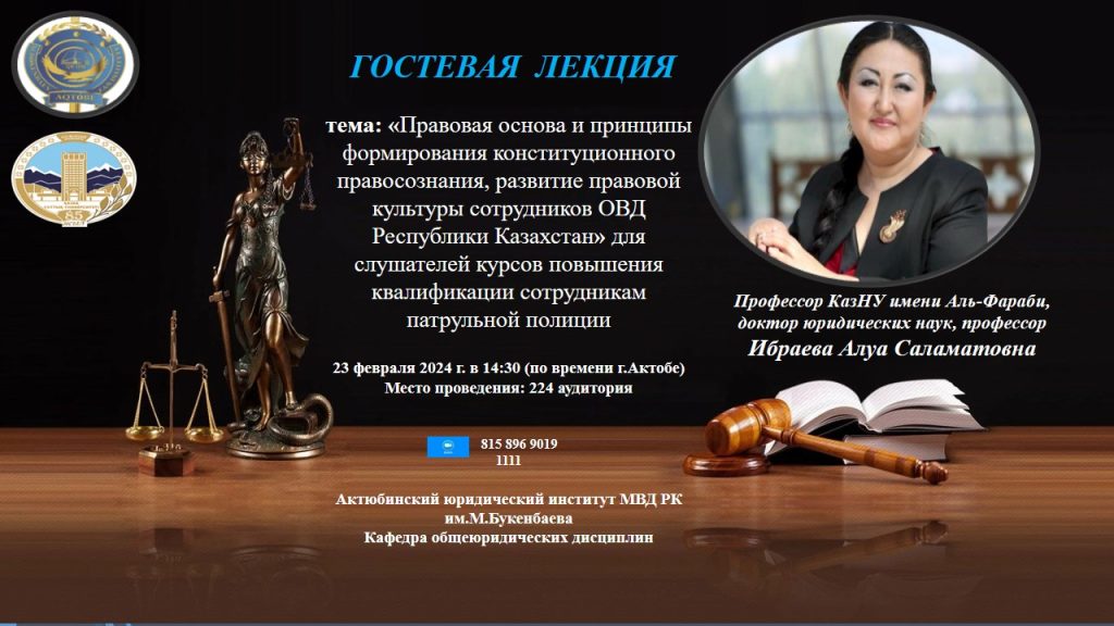 Осыған орай 2024 жылғы 23 ақпанда жалпы заң пәндері кафедрасының бастығы полиция полковнигі А.К.Ибраева ҚР ІІМ М.Бөкенбаев атындағы Ақтөбе заң институтының біліктілікті арттыру және мамандарды қайта даярлау факультетінде білім алып жүрген патрульдік полиция қызметкерлері үшін қонақ дәрісін ұйымдастырды.