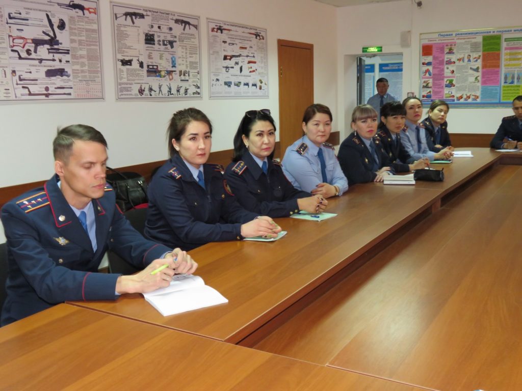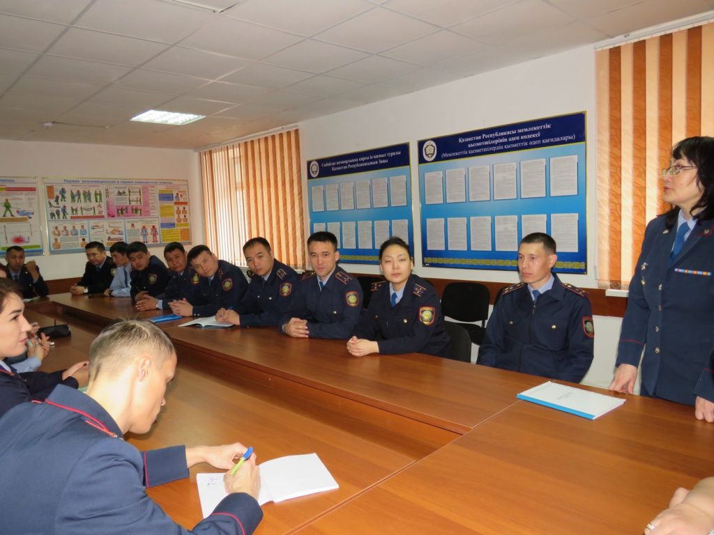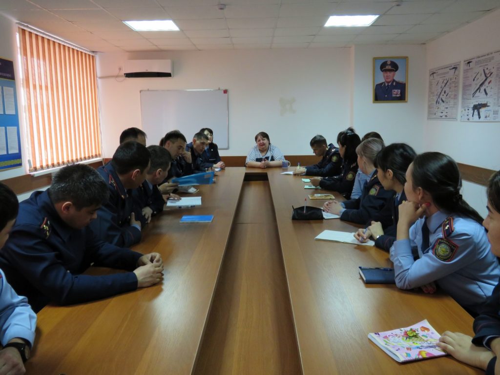 On April 10, 2019 according to the work Plan of the Department of General subjects for the 2018-2019 academic year, the head of the Department, police Colonel A. F. Sattarova conducted a training session with the involvement of the Deputy head of the Center for adaptation of minors in Aktobe region T. V. Litvinova with the students of training courses «Protect children together» – officers of the juvenile police units of the IAD regions of the Republic on the discipline «Special training» on the theme «Psychological and pedagogical reasons for committing offenses by minors».