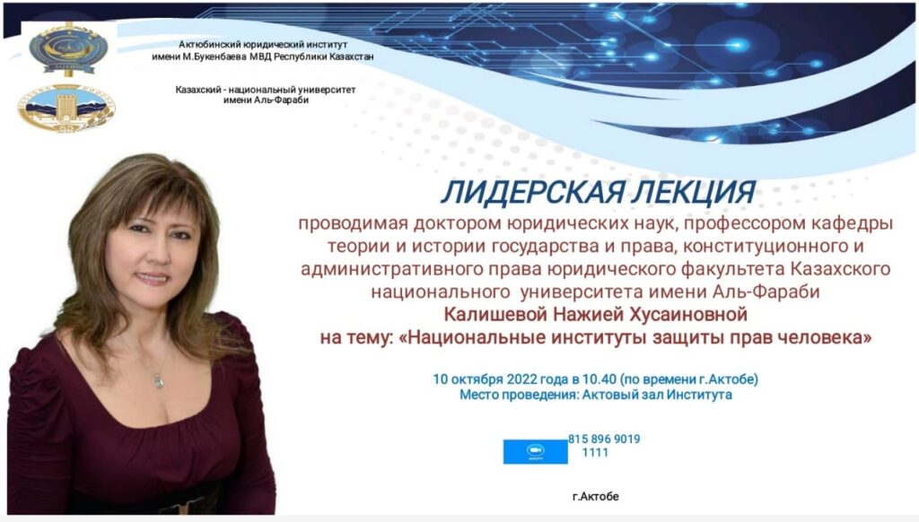 2022 жылғы 10 қазан күні ҚР ІІМ М.Бөкенбаев атындағы Ақтөбе заң институтының жалпы заң пәндері кафедрасының аға оқытушысы полиция подполковнигі А.С.Маханова алғашқы кәсіби даярлық курсына ІІО қатардағы кіші және орта басшы құрамдағы лауазымдарына алғаш рет қабылданатын тыңдаушыларына Әл-Фараби атындағы Қазақ ұлттық университеті заң факультетінің мемлекет және құқық теориясы мен тарихы, конституциялық және әкімшілік құқық кафедрасының профессоры, заң ғылымдарының докторы Калишева Нажия Хусаиновнаны қатыстыра отырып «Адам құқықтары» пәні бойынша №4 «Адам құқықтарын қорғаудың ұлттық институттары» тақырыбына онлайн режимде көшбасшылық дәріс өткізді.