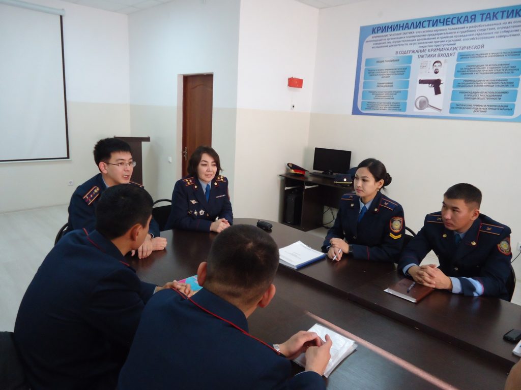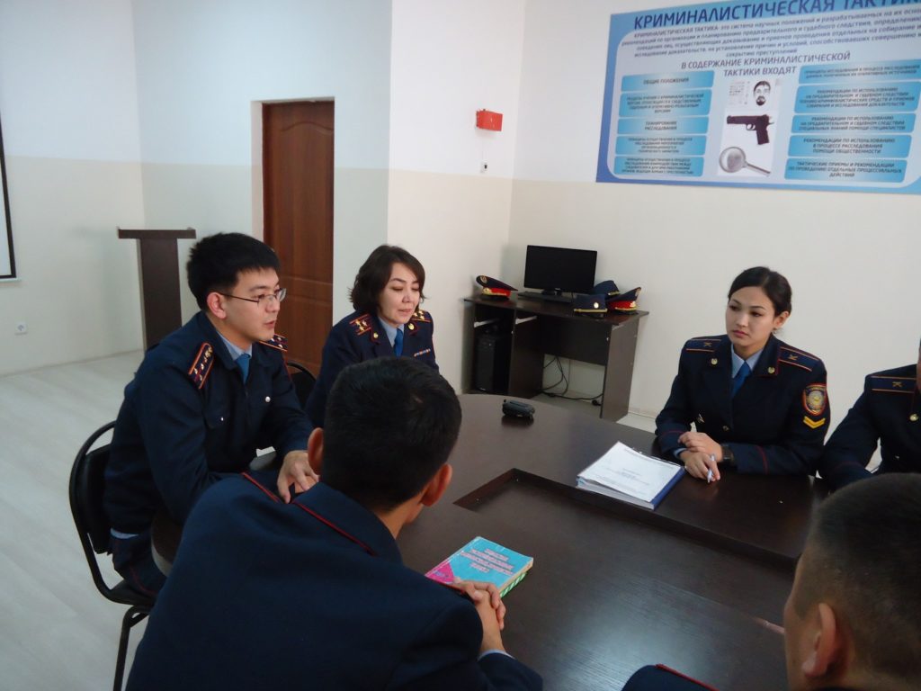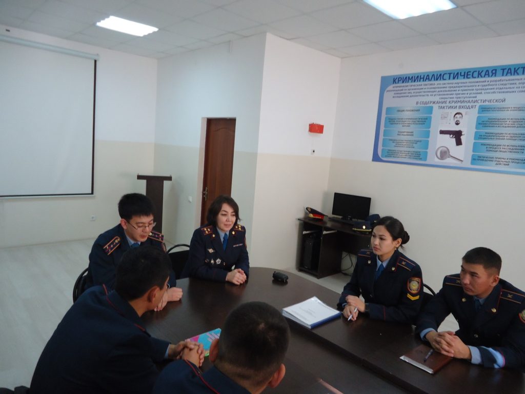 The lesson was held in a very lively and interesting form, the cadets received certain knowledge on the methods and patterns of tactics of conducting an inspection of the scene with the use of known and new technical and forensic tools and methods, also specific situational examples from the practice of the PD of Aktobe region on the use of evidence and types of investigative actions were considered.