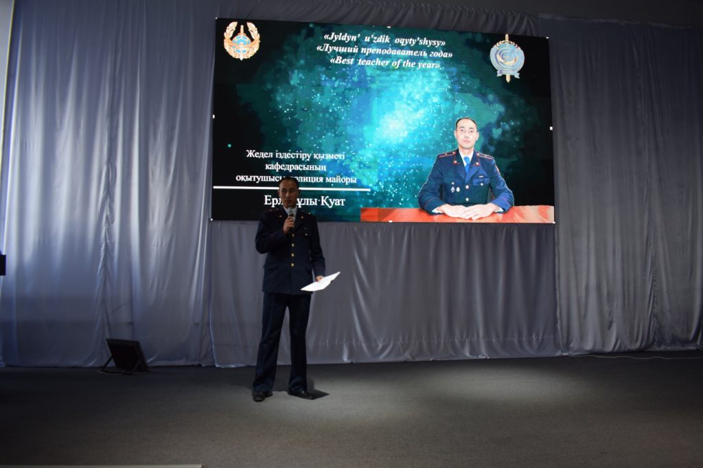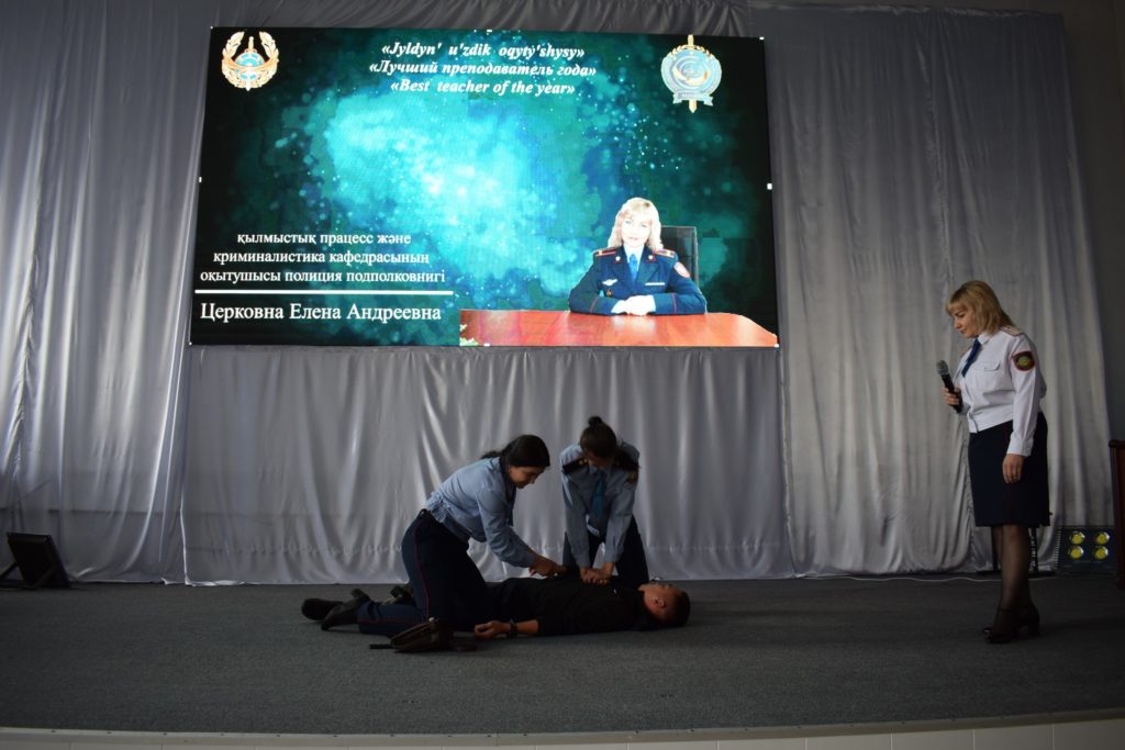 In the competition took part the Deputy Head of the Department of operational-investigative activities police Lieutenant Colonel Zh. A. Ayupov, senior lecturer of the Department of criminal process and criminalistics, police Lieutenant Colonel N. A. Chuprinyuk, senior lecturer of the Department of general disciplines, police Major A. Zh. Zharaskhan, lecturer of the Department of criminal process and criminalistics, police Lieutenant Colonel E. A. Cerkovnova, lecturer of the Department of operational-investigative activity, police Major K. Yerlanuly, lecturer of the Department of general legal disciplines, police Major M. D. Tuleshev, lecturer of administrative law and administrative activities of IAB, police Major S. R. Kalipova, lecturer of the Department of military and physical training, police Major D. A. Duysembaeva.