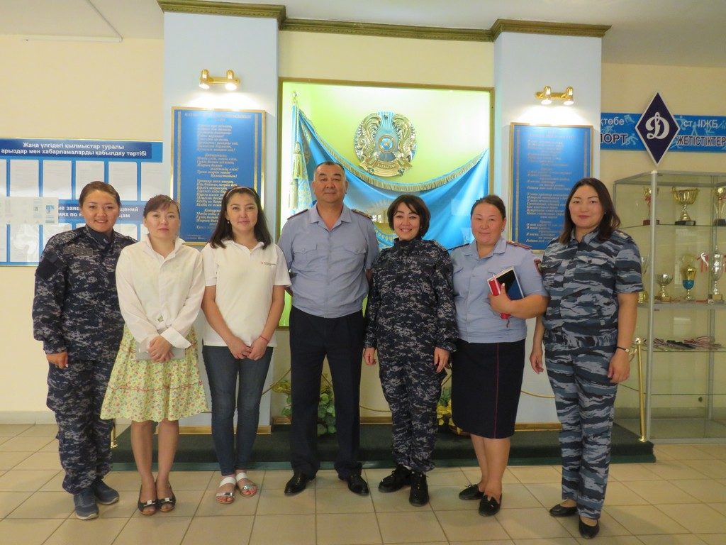 2019 жылғы 5 шілдеде Көліктегі Полиция департаментіне қарасты Ақтөбе станциясындағы желілік полиция бөлімінің қызметкерлеріне Қазақстан Республикасы ІІМ М.Бөкенбаев атындағы Ақтөбе заң институтының басшылығының қолдауымен «Тактикалық-арнайы дайындық» бойынша дәрігерге дейінгі алғашқы медициналық, психологиялық көмек, көрсету тәжірибелік дәріс сабағын өткізді. Дәрісті өткізушілер Қызыл ай қоғамдық бірлестігінің Ақтөбе облыстық филиалының қызметкері Тажибаева Замзагуль Аюповна, Қазақстан Республикасы ІІМ М.Бөкенбаев атындағы Ақтөбе заң институтының қылмыстық процесс және криминалистика кафедрасының бастығы полиция подполковнигі Нелли Талапқызы Саханова, жалпы білім беру кафедрасының аға оқытушысы полиция майоры Жайнагүл Айсұлтанқызы Жукаева және қылмыстық процесс және криминалистика кафедрасының оқытушысы полиция майоры Зарина Амангелдіқызы Мухангалиева. Дәріс өткізу барысы шынайылыққа барынша сай болуымен, әртістік шеберлікпен, қобалжулар мен абыржу хәлдерін, сынық, сіңірдің созылуы, күйік шалғанда, үсік шалғанда, уланғанда, күн сәулесінен, электр тоғына түскенде, зардап шегушіні тасымалдау және жасанды дем беру, жүрек тұсын уқалау әдістері мен тәсілдері егжей-тегжейлі түсіндірілді.