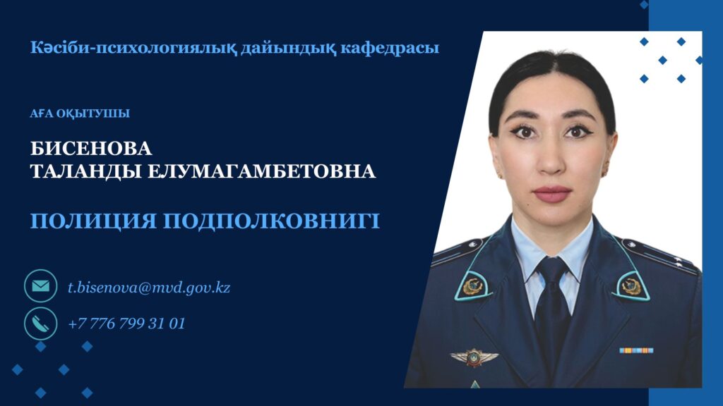 «Ішкі істер органдары курсанттарының қарқынды кәсіби даярлық жағдайында стресске төзімділікті және эмоциялық интеллектіні дамыту өзекті мәселелері» атты ғылыми-зерттеу тақырыбы аясында 2025 жылғы 18 тамызда дөңгелек үстел өткізілді. Іс-шараның мақсаты – болашақ полиция қызметкерлерінің кәсіби және жеке қасиеттерін қалыптастыруда эмоциялық интеллектінің рөлі мен маңызын талқылау, сондай-ақ ІІМ жүйесінде эмоциялық құзыреттілікті дамыту тәжірибесімен алмасу болды.