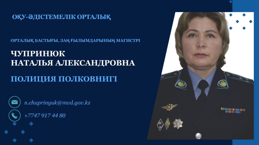 Оқу-әдістемелік орталықты заң ғылымдарының магистрі полиция полковнигі, Чупринюк Наталья Александровна басқарады