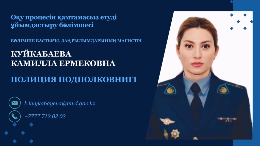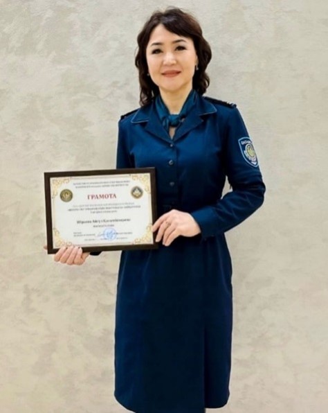 Қазақстан Республикасы ІІМ М.Бөкенбаев атындағы Ақтөбе заң институтында өткізілген 2023-2024 оқу жылындағы «Жоғары оқу орнының үздік оқытушысы» институтшілік байқауының нәтижесі бойынша жалпы заң пәндері кафедрасының бастығы, заң ғылымдарының кандидаты, қауымдастырылған профессор, полиция полковнигі Айгуль Касымбековна Ибраева 1-орын женімпазы атанды.