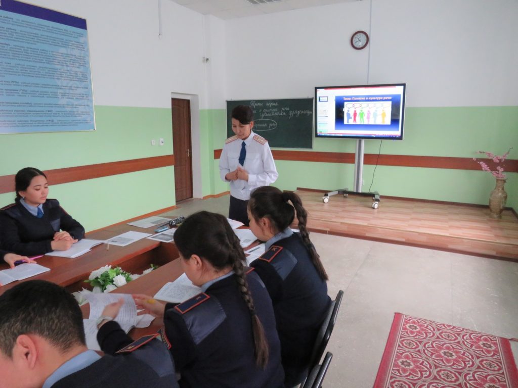 2019 жылғы 03 сәуірде жалпы білім беру пәндері кафедрасының жұмыс жоспарына сәйкес орыс тілі пәні бойынша оқытушы полиция майоры С.А.Мендыбаева «Понятие о культуре речи» тақырыбында ашық тәжірибелік сабақ өткізді. Кіріспе бөлімде оқытушы сабақ тақырыбы мен оны өткізу жоспарымен таныстырды, сондай-ақ курсанттарға “ІІО қызметкерлерінің сөйлеу мәдениеті” туралы түсіндірді.