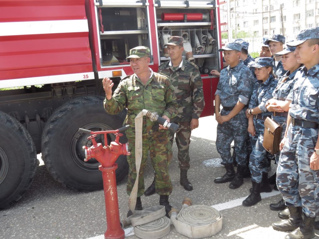 Экипаж сотрудников пожарной части прибыл на территорию института на пожарной автомашине,специально приспособленной для тушения пожаров. В ходе обучения начальником караула,старшим лейтенантом гражданской защиты Мухиевым Д.слушателям была разъяснена тема профилактики пожаров, защиты жизни людей и виды технических средств для тушения пожаров.