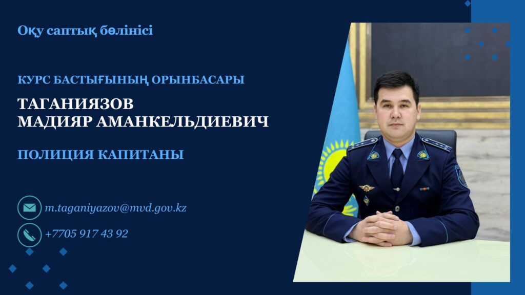 Бүгінгі таңда курсанттармен қызметкерлер жұмыс жасайды: Курс бастығы. полиция капитаны Е.Ж. Буранкулов, курс бастығының орынбасары полиция капитаны М.А. Таганиязов, взвод командирі полиция аға лейтенанты А. Ермекалы, курс старшинасы полиция старшинасы М.Т. Тажмаганбетов.