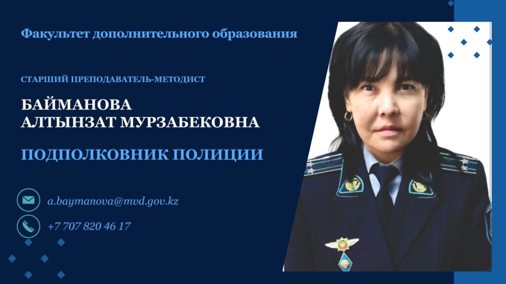 Старший преподаватель-методист Факультета подполковник полиции Байманова Алтын Мурзабековна;