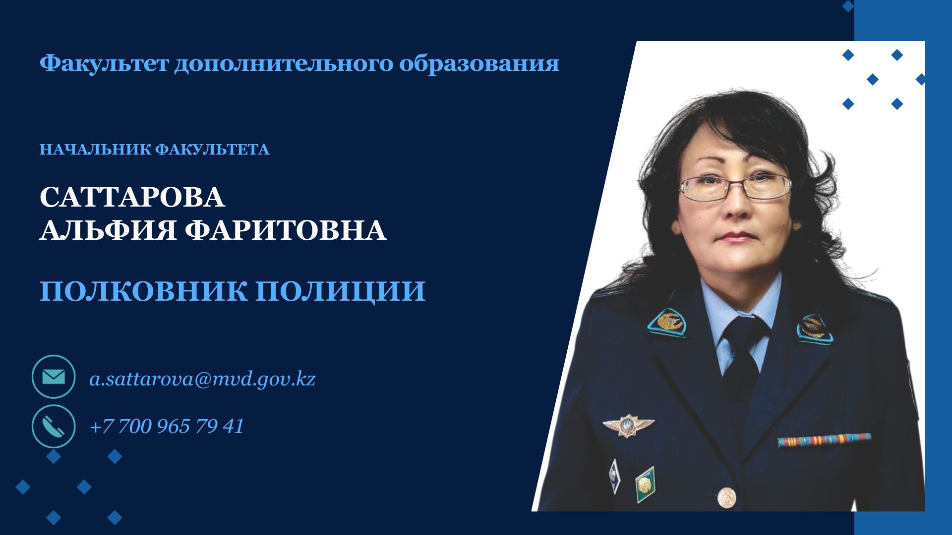 Начальник Факультета – полковник полиции Саттарова Альфия Фаритовна;