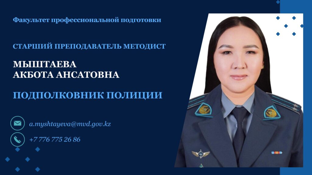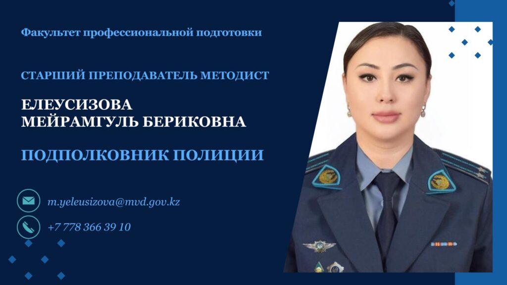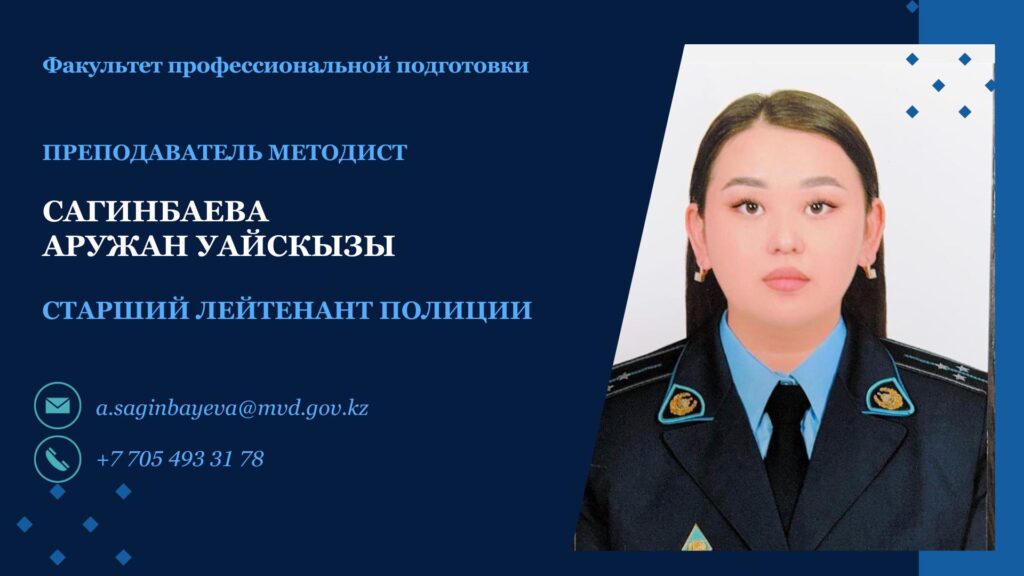 – преподаватель-методист – старший лейтенант полиции Сагинбаева Аружан Уайскызы.
