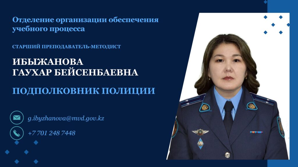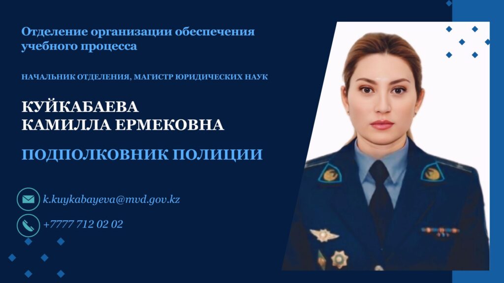 начальник отделения магистр юридических наук, подполковник полиции Куйкабаева Камилла Ермековна;