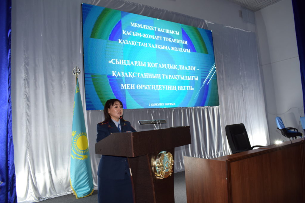 Со следующим слово выступила начальник кафедры общеправовых дисциплин Актюбинского юридического института МВД РКимени М. Букенбаева, подполковник полиции, кандидат юридических наук Ибраева Айгул Касымбековна. Она отметила важные моменты Послания: