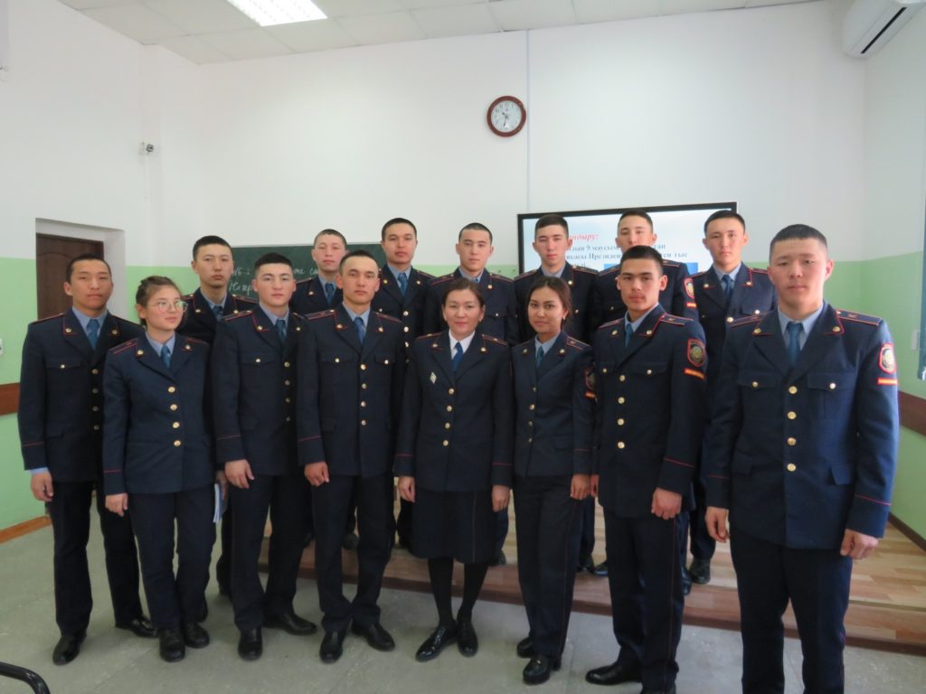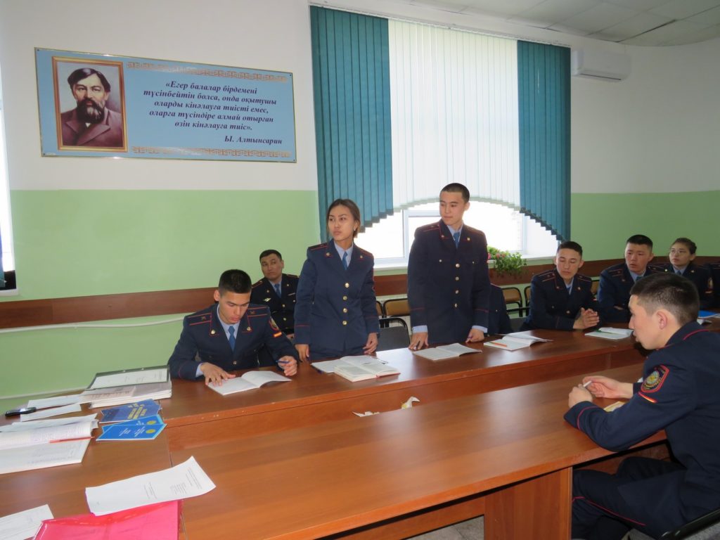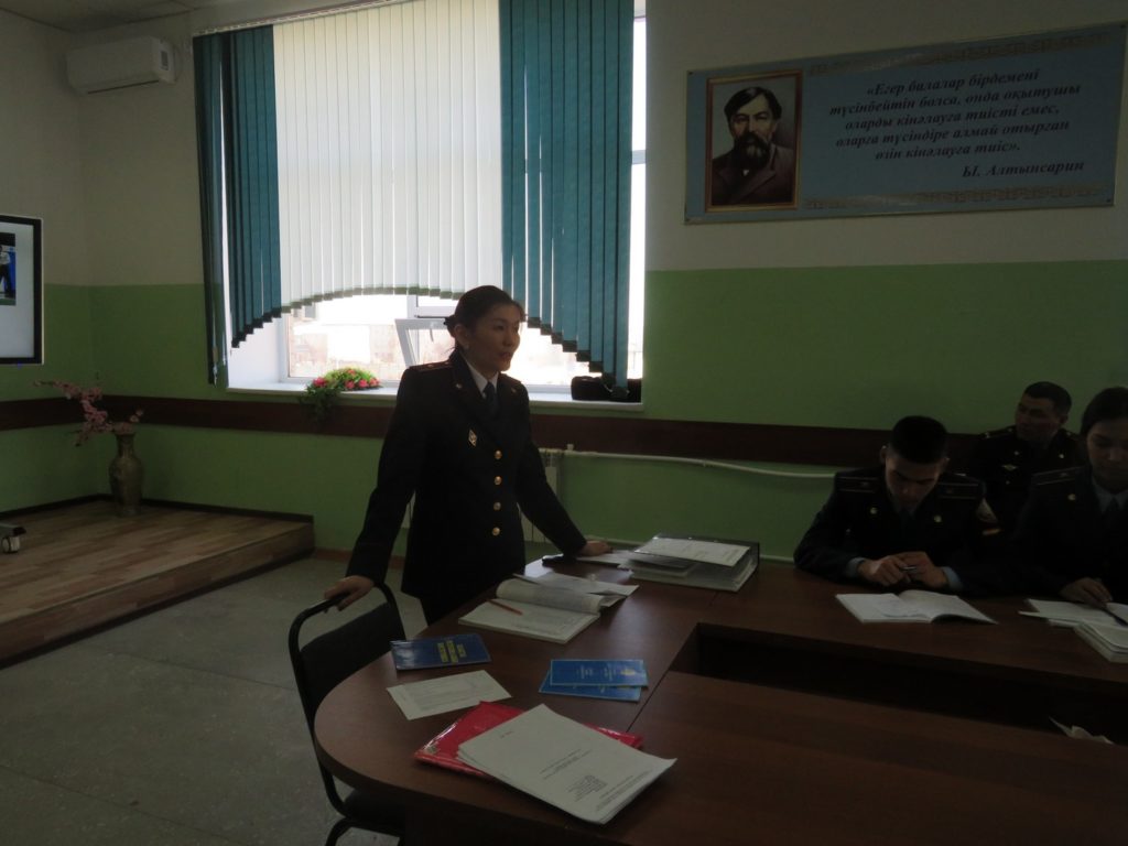 Открытое занятие проходило в игровой форме, в первом туре курсанты были разделены на две группы, затем отвечали на блиц-опрос, ситуационные задачи, карточки и тестовые вопросы. А второй тур был посвящен выборам «Молодежного обмудсмена», был показ видеороликов подготовленных курсантами в кандидаты обмудсмена, далее прошли выборы. В заключении молодежным обмудсменом был избран курсант 1А курса 103 учебной группы Майлыбаев Шалатай.
