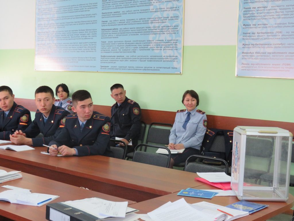 11 апреля 2019 года старшим преподавателем кафедры общеобразовательных дисциплин, майором полиции Жарасхан А.Ж. в рамках конкурса «Лучший преподаватель года»было проведено открытое семинарское занятие с курсантами 1А курса 103 учебной группы по дисциплине «Политология» на тему«Выборы и избирательные системы».