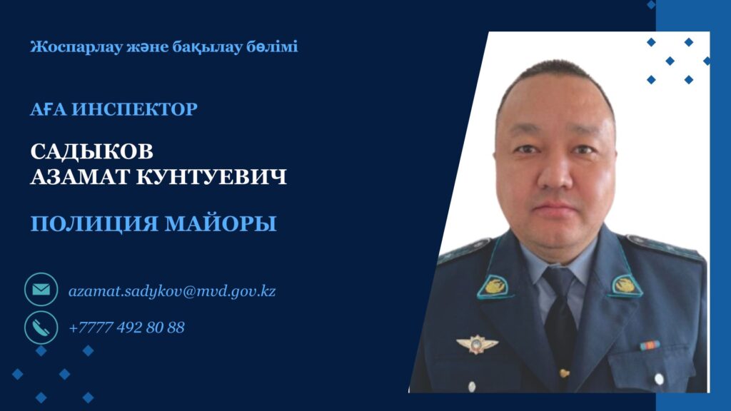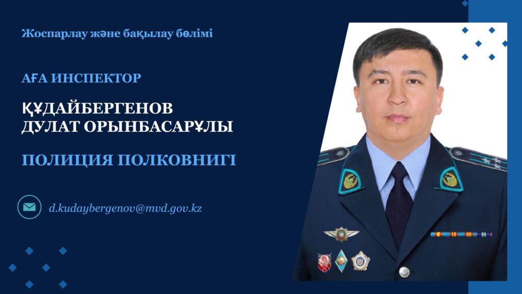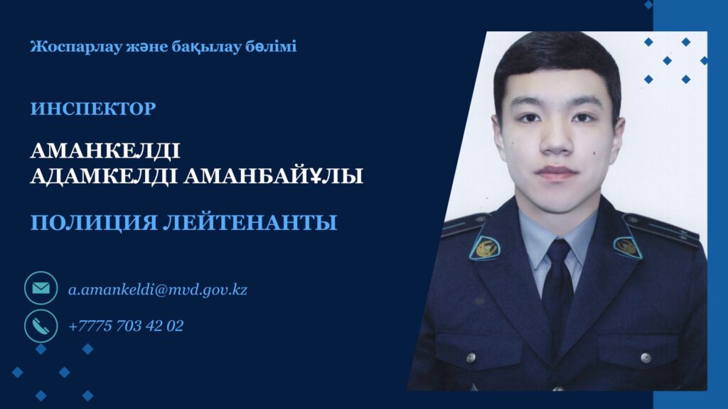 Жоспарлау және бақылау бөлімін полиция полковнигі Айнагуль Тайшыбаева Сагандуковна басқарады, оның қарамағында аға инспектор полиция майор Азамат Кунтуевич Садыков және инспектор полиция лейтенанты Аманкелді Адамкелді Аманбайұлы жұмыс істейді.